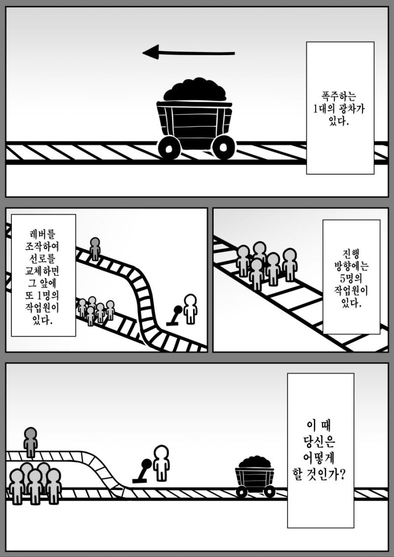 항상 선로를 폭파하겠다는 둥 사람을 풀어주겠다는 둥 엉뚱한 방향으로 나가서 제대로 진행되는 걸 본 적이 없는 사고실험.